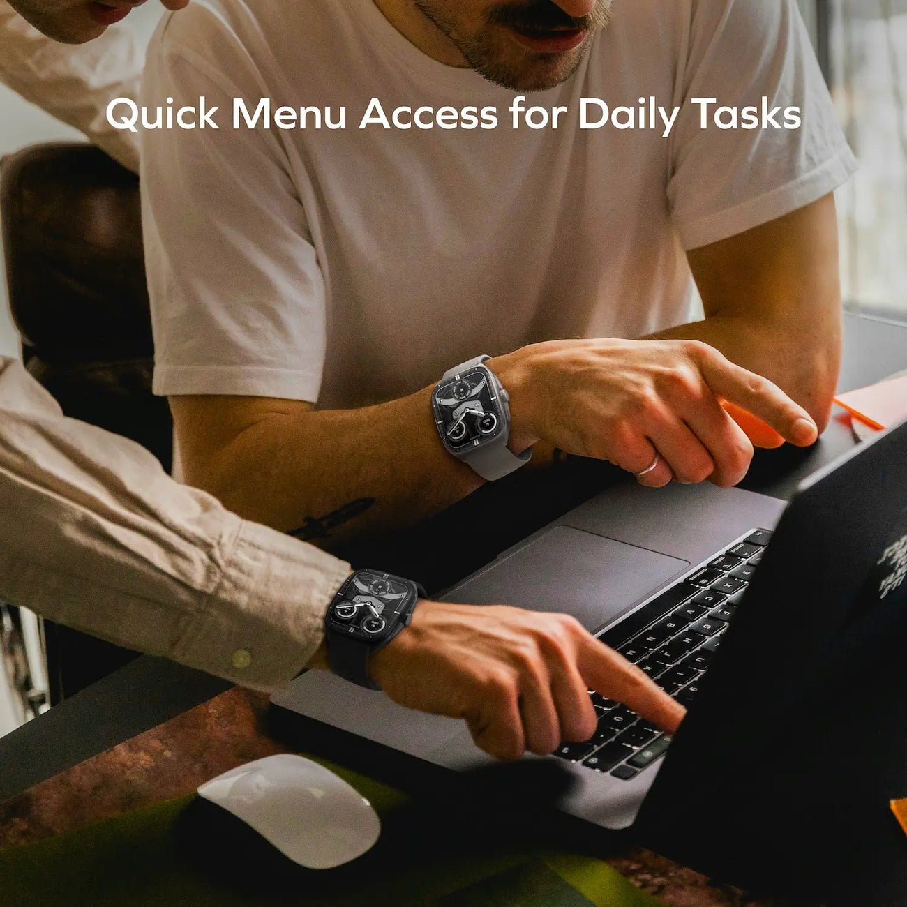 Navigating the 1-Wear Curvex is a breeze thanks to its intuitive touch controls and sleek rotatable crown. Easily access menus, switch apps, and customize settings with precision. Plus, with essential features like drinking water reminders, real-time weather, remote camera control, music control, and more, this smart watch is your indispensable daily companion.