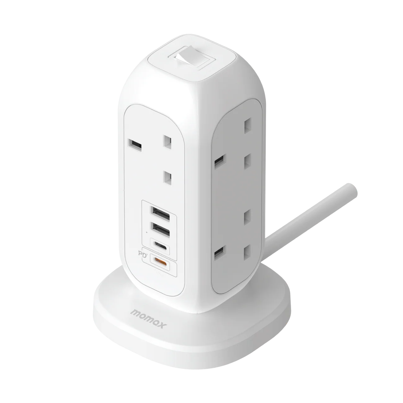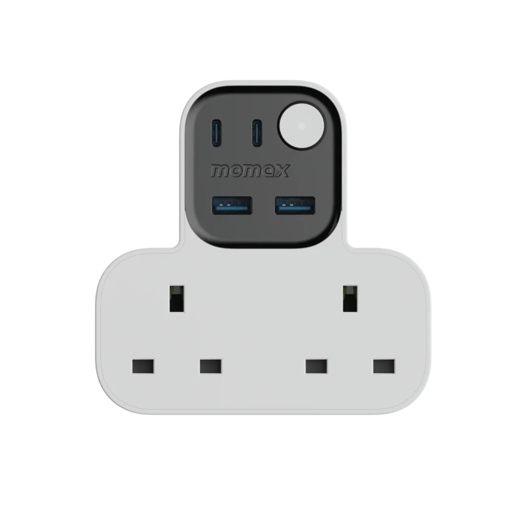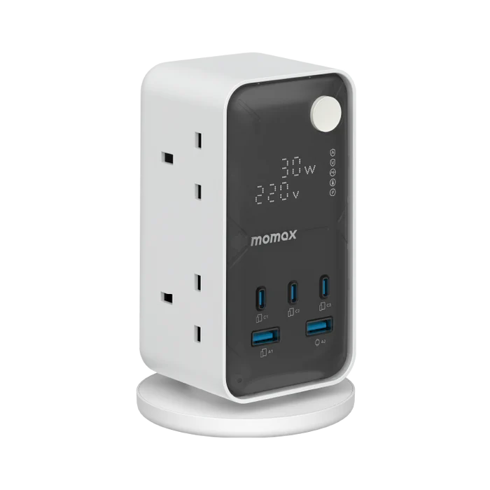 The Momax OnePlug maximizes charging efficiency and minimizes clutter with multi-device fast charging capability, including 7 AC outlets and multiple USB ports, featuring a powerful 20W USB-C PD for quick charging, while prioritizing safety with advanced surge protection and an automatic safety breaker for enhanced device protection.